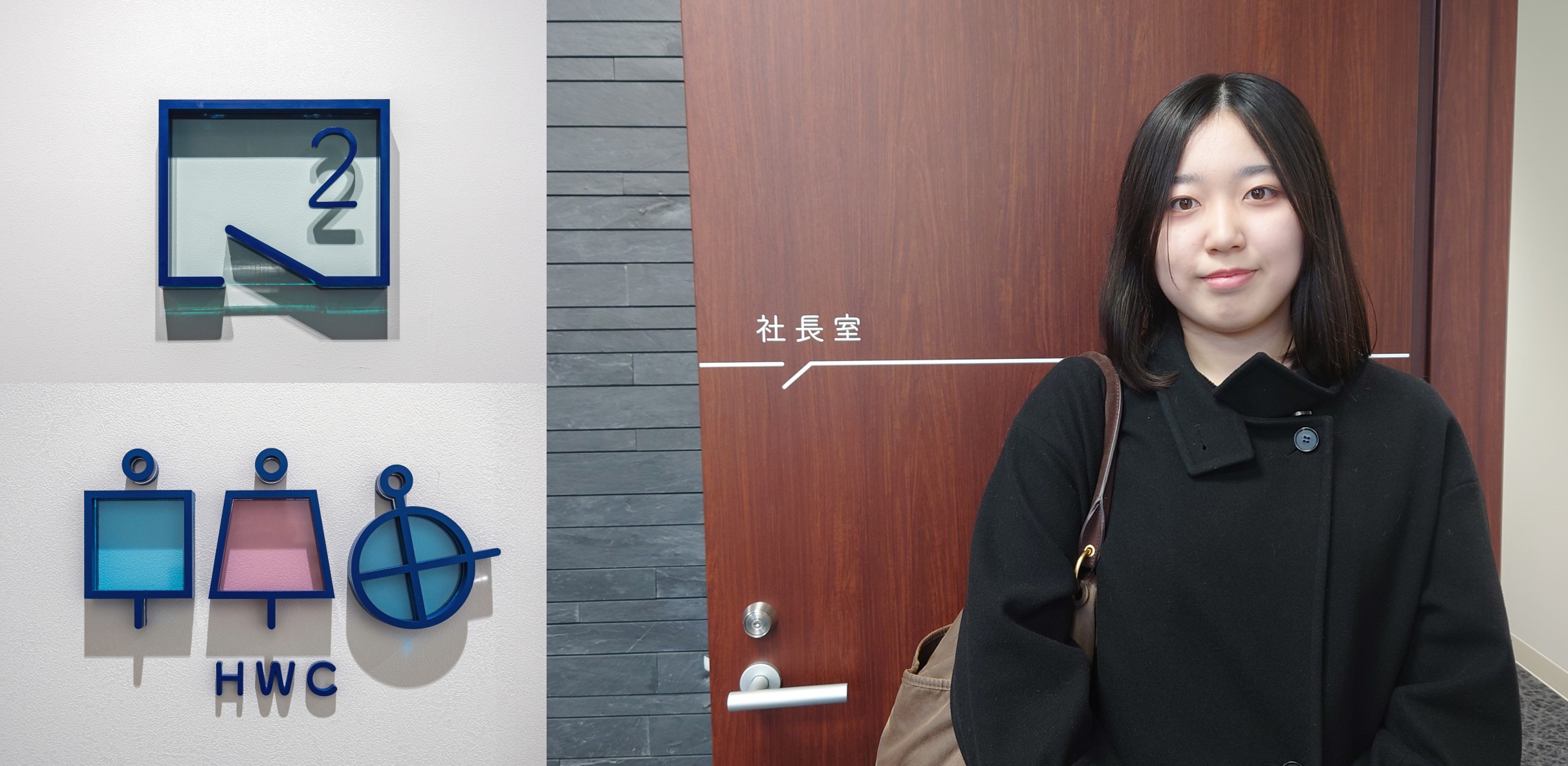 新社屋の室内サインは、西日本工業大学デザイン学部情報デザイン学科3年生 福岡 美月さんにデザインを担当していただきました。階段や室内扉は電気回路図のスイッチがモチーフになっており、電気工事会社である当社をイメージしたという発案をそのまま採用いたしました。今後も産学連携を通した、学生のキャリア支援を進めてまいります。